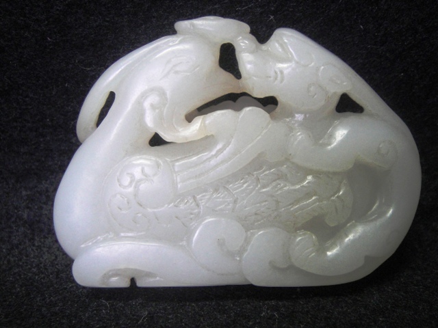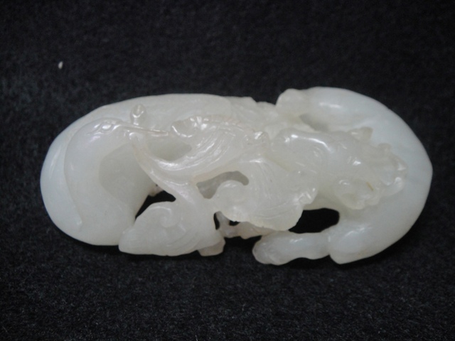 羊脂白玉籽料雕琢而成,龍鳳鰜鰈情深,唯妙唯俏,雕工已達爐火存菁之境界。