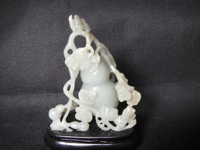 葫蘆為主體,鏤空雕枝藤、葉片、翩蝠,体若凝脂,包漿相當厚實,論玉質本件為一時之選。